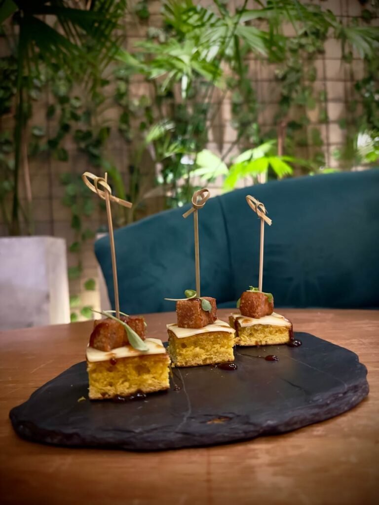 - Maicitos gratinados: Maicitos en salsa blanca con base de pico de gallo, acompañados de nachos