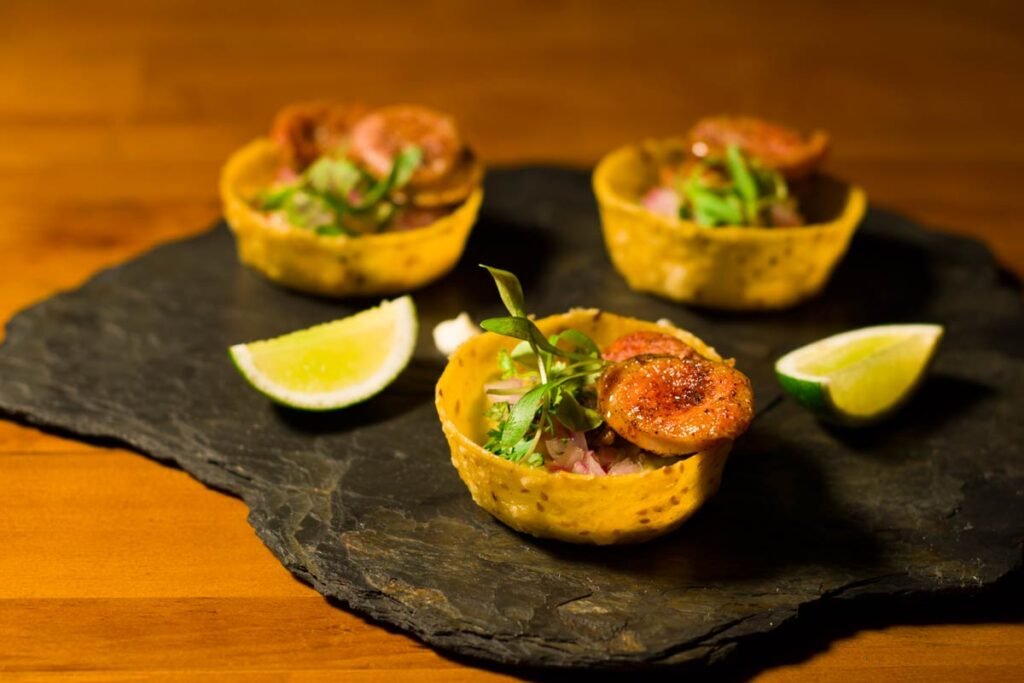 - Tapas de chorizo: Canastas de maíz con guacamole, cebolla, rábanos encurtidos y chorizo